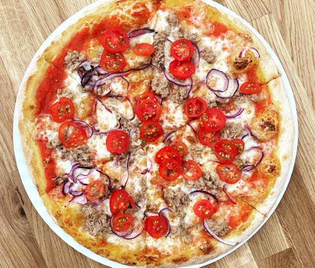 sos marinara, mozzarella, czerwona cebula, tuńczyk, pomidorki koktajlowe -